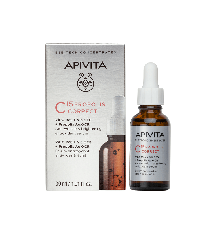 APIVITA serum s vitaminom C je snažan saveznik u borbi protiv beživotnog i umornog izgleda kože. Formuliran je s trostrukom snagom ključnih sastojaka – 15% stabiliziranog vitamina C, vitamina E i patentiranog propolisa AoX-CR, koji sinergijski djeluju na poboljšanje teksture i tona kože.