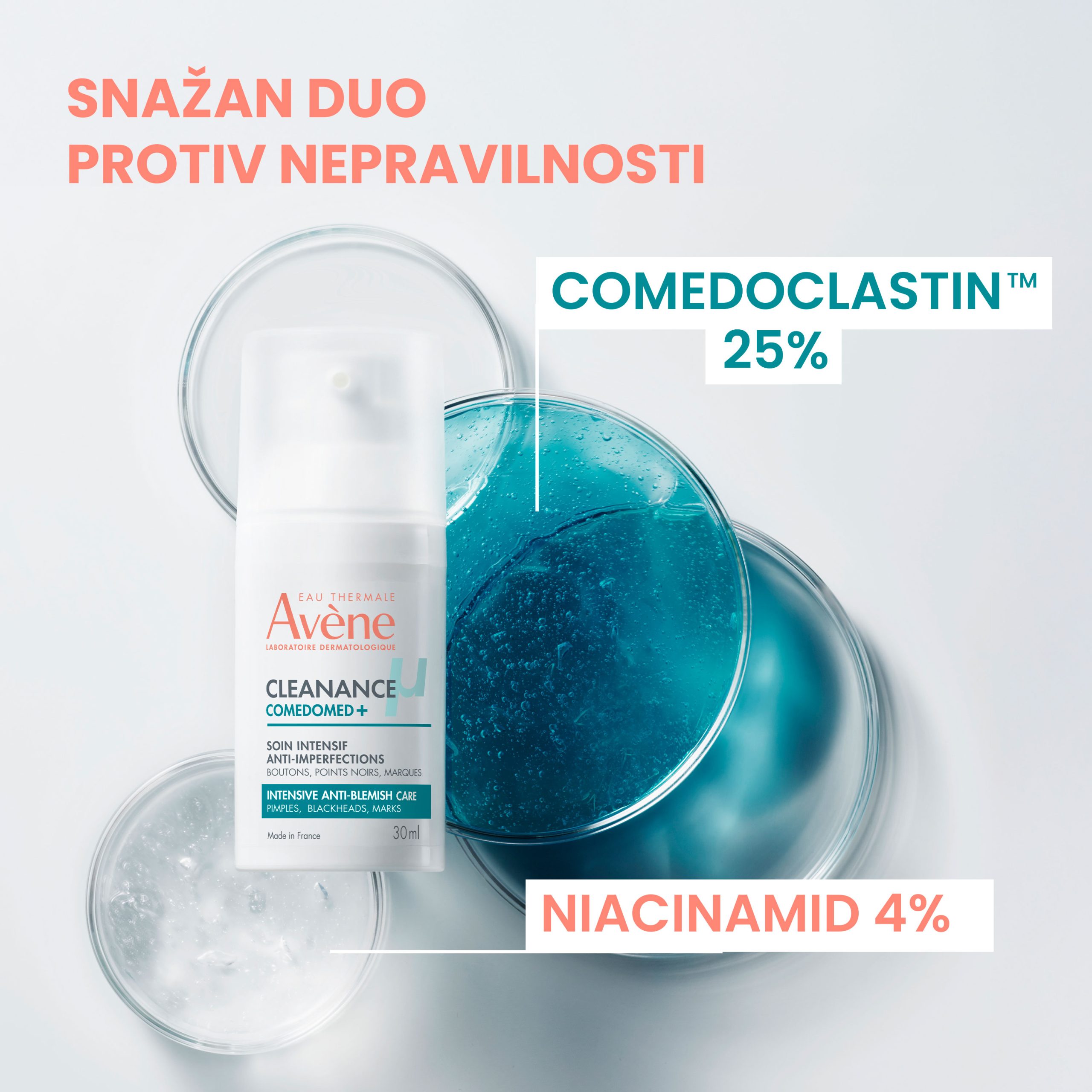 • ComedoclastinTM je djelatna tvar s patentiranim svojstvima, regulira prekomjerno lučenje sebuma.