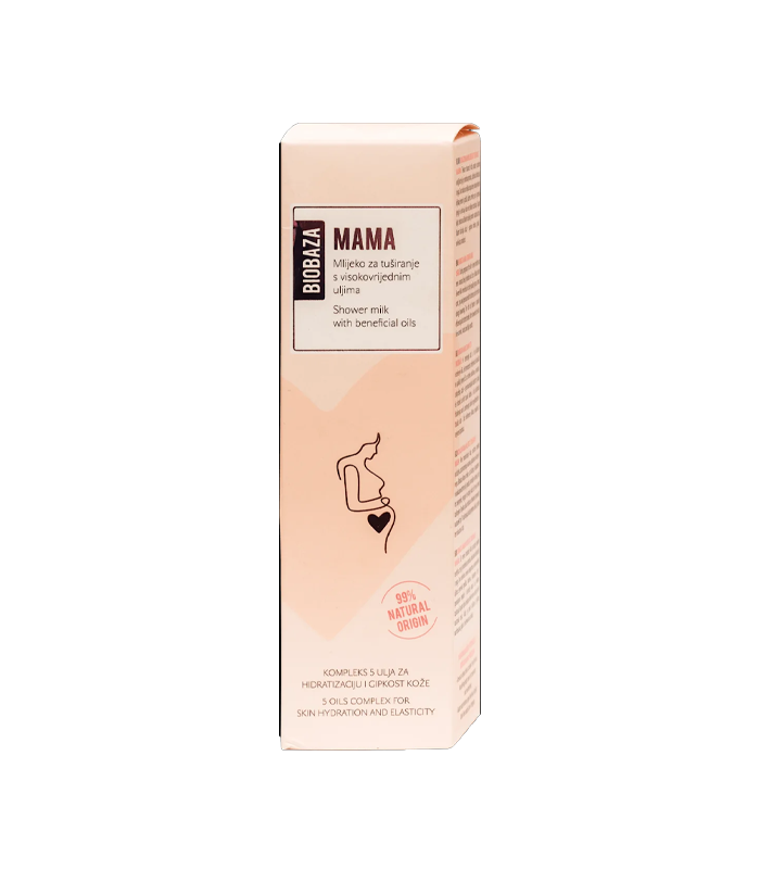 BIOBAZA Mama mlijeko za tuširanje, savršena njega za trudnice i mame. Formulacija obogaćena uljem sjemenki grožđa, badema, mrkve, soje i geranija nježno čisti, učvršćuje i njeguje kožu. Osim toga, bogata uljana tekstura učinkovito štiti kožu od nastanka strija. Svi sastojci su na prirodnoj bazi i potpuno sigurni za upotrebu. Dermatološki testirano. BIOBAZA Mama mlijeko za tuširanje – za lijepu i njegovanu kožu!