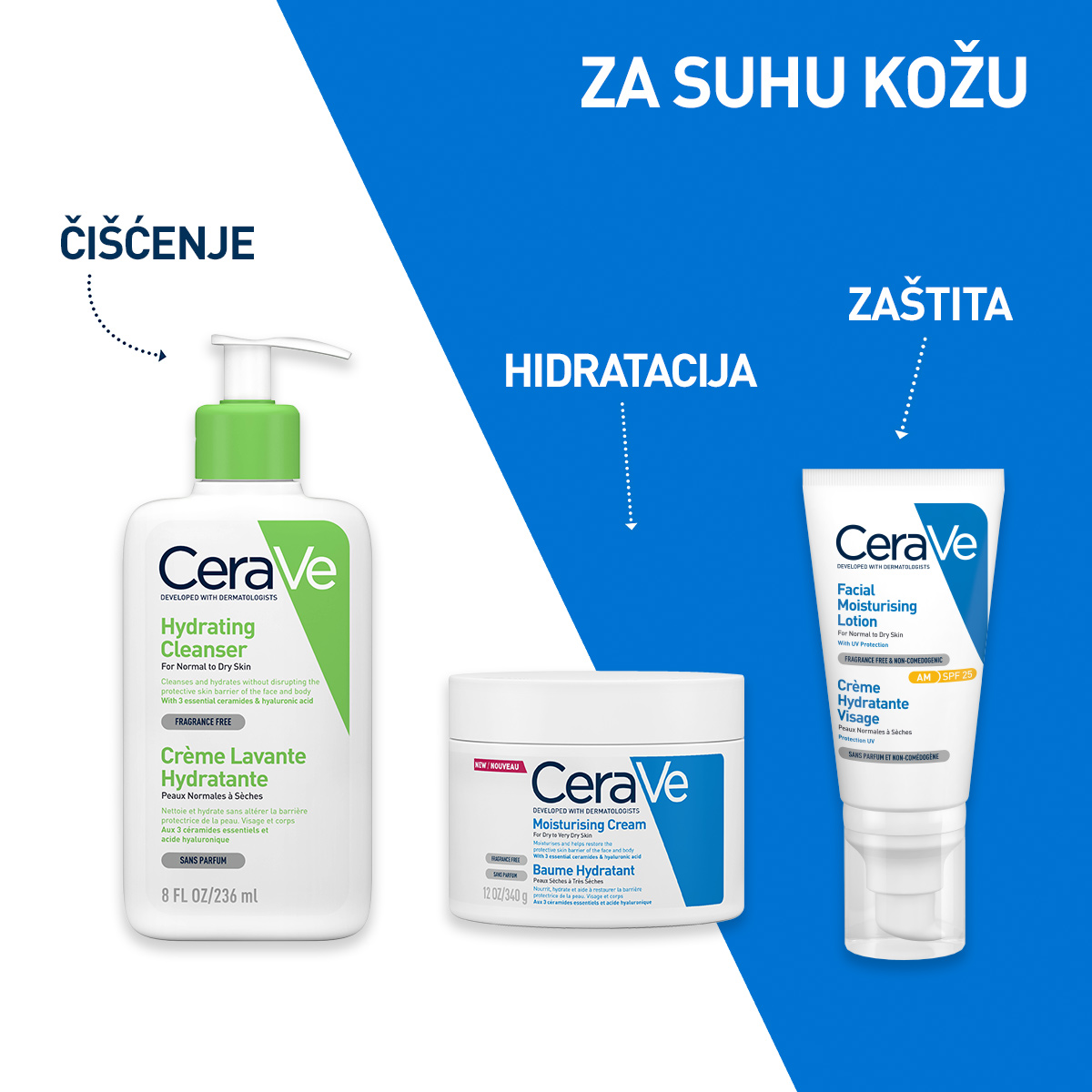 Čisti i hidrira bez narušavanja zaštitne barijere kože lica i tela. Za normalnu do suhu kožu. Sadrži 3 esencijalna ceramida i hijaluronsku kiselinu. Bez mirisa. Hipoalergeno.