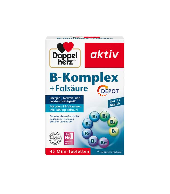 Doppelherz® aktiv B-Kompleks + folna kiselina DEPO sadrži svih 8 B vitamina u jednoj mini tableti.