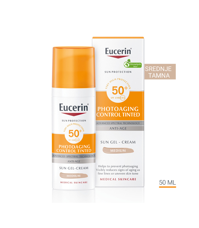 Eucerin Sun Photoaging Control tinted gel-krema SPF 50+ srednje tamne nijanse svakodnevna je zaštita od sunca za kožu lica koja trenutno ujednačava igled kože i vidljivo smanjuje znakove starenja kože poput finih linija ili neujednačenog izgleda kože. Napredna spektralna tehnologija kombinira širokopojasne i fotostabilne UVA/UVB filtere1 za visoku UV zaštitu s likokalkonom A za neutralizaciju slobodnih radikala uzrokovanih UV i HEVIS svjetlošću. Eucerin Sun Photoaging Control tinted gel-krema u srednje tamnoj nijansi sadržava visoki faktor zaštite od sunca potreban za sprječavanje fotostarenja, sa dugotrajnom pokrivenošću i brzim upijanjem zahvaljujući svojoj laganoj i neljepljivoj teksturi bez parfema. Prikladna za korištenje 4 dana nakon laserskog/kemijskog tretmana. Hijaluronska kiselina i mineralni pigmenti u formuli odmah ujednačuju ten i vidljivo smanjuju znakove starenja, kao što je pojava finih linija ili neujednačen ton kože. Kliničke i dermatološke studije dokazuju vrlo dobru podnošljivost čak i na osjetljivoj koži.