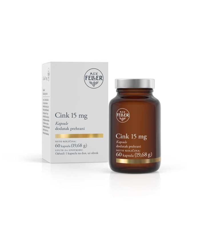 M.E.V. Feller® Cink 15 mg u preporučenoj dnevnoj dozi (1 kapsula) sadrži 15 mg cinka što je 150% preporučenog unosa za odrasle osobe.