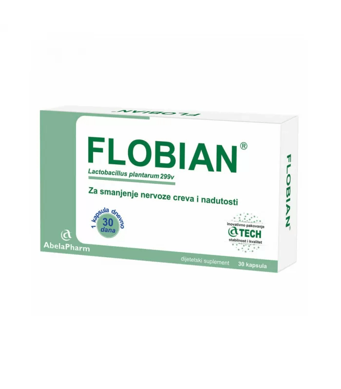Flobian® je dijetetski suplement koji dugotrajno ublažava sve simptome nervoznog crijeva. Flobian® djeluje na uzrok problema, jer posebnim patentiranim mehanizmom prijanja na površinu crijevnog epitela sprečavajući djelovanje štetnih bakterija i na taj način smanjuje nastanak gasova, nadutost, grčeve, bol u stomaku i reguliše stolicu. Aktivan sastojak Lp299v u Flobian® kapsulama je originalan, patentiran i detaljno ispitan u nizu kliničkih studija. Za optimalan efekat savjetuje se primjena preparata od najmanje 4 nedjelje.
