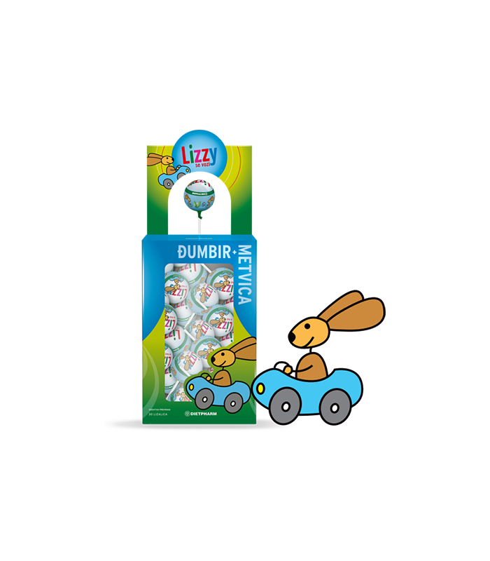 Dodatak prehrani s đumbirom i paprenom metvicom. Lizzy se vozi lizalica proizvod je s biljnim ekstraktima namijenjen djeci. Mogu ga koristiti djeca od 4. godine.