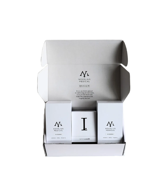 Naš ekskluzivni paket sadrži kultni Novelius Medical kolagen za ljepotu, vitalnost i dugovječnost te ručno izrađenu svijeću s najfinijim parfemskim uljima, koja budi Vaš unutrašnji plamen i smiruje um, stvarajući nezaboravno iskustvo za osjetila. Ovo je savršen način da se započne Nova godina – osnažujući ljepotu iznutra i izvana, dok istovremeno pronalazite trenutke opuštanja i mira. Darujte sebi i voljenima ovaj izuzetan paket za blistav i uravnotežen početak 2024!
