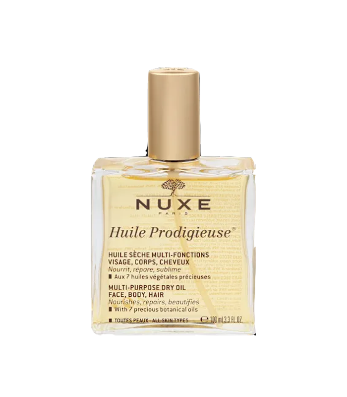 Nuxe Huile Prodigieuse® čudesno suho ulje višenamjensko je ulje za njegu lica, tijela i kose. Formula sadrži 7 dragocjenih biljnih ulja: ulje slatkog badema, kamelije, borača, lješnjaka, makadamije i argana. Intenzivno njeguje i hrani kožu te joj pruža antioksidativnu njegu. Kožu obavija senzualnim mirisom koji sadrži cvjetne note i tople note vanilije i kokosovog mlijeka. Sadrži najmanje 98.1 % sastojaka prirodnog porijekla te ne sadrži konzervanse, silikone i mineralno ulje.