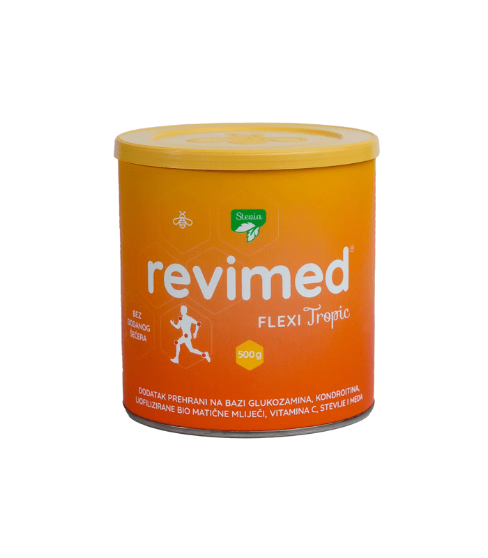 REVIMED® Flexi Tropic dodatak prehrani vrhunskog kvaliteta, koji objedinjuje pažljivo odabrane prirodne sastojke za podršku zglobovima, kostima te jačanju imuniteta. Njegova jedinstvena formula, obogaćena glukozaminom i kondroitinom – prirodnim tvarima prisutnim u našim zglobovima – te BIO matičnom mliječi, dehidriranim medom, stevijom i vitaminom C, pruža cjelovitu zaštitu organizmu. Namijenjen je za pripremu osvježavajućeg napitka s okusom tropskog voća.