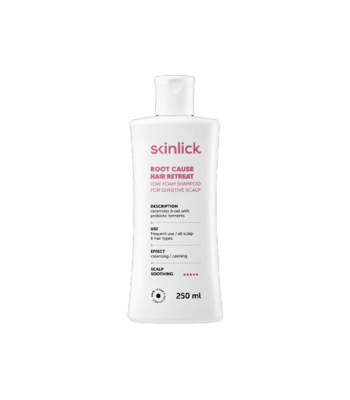 Skinlick Root Cause Hair Retreat Shampoo je blagi šampon za čišćenje osjetljivog vlasišta koji djeluje umirujuće i njegujuće te pomaže zagladiti vlas kose.