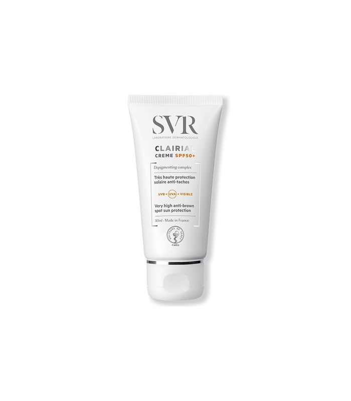 Clairial krema SPF 50+ reducira i sprječava isticanje postojećih smeđih mrlja (tamne mrlje nastale tijekom trudnoće, mrlje nastale zbog osjetljivosti na svjetlost). Sprječava pojavu smeđih mrlja zbog izloženosti suncu te posebno nakon dermatoloških tretmana (piling, laser i sl.).