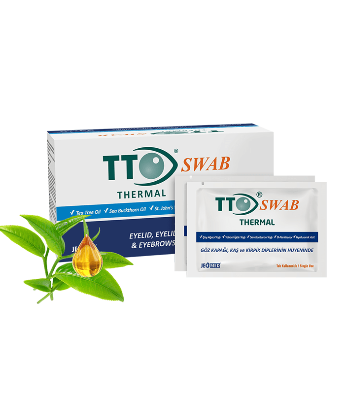 Očistite područje oko očiju, kapaka, rubove kapaka i obrve TTO termalnom maramicom u kombinaciji sa masažom ruba očnog kapka. Koristite posebnu maramicu za svako oko. Ispiranje nije potrebno. Obratite pažnju na higijenu ruku prije korištenja maramica.