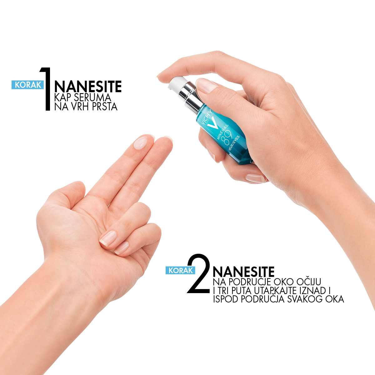 Preporučuju se pokreti nanošenja za optimalnu učinkovitost njege Minéral 89 Eyes. 1) Kapljicu seruma nanesite na vrškove prstiju i rasporedite je ispod svakog oka: 3 tapkanja iznad i ispod svakog oka.2) Nježno utisnite svaku kapljicu proizvoda na područje oko očiju pomoću 2 prsta kako bistedrenirali vrećice ispod očiju i uklonili natečenost. 3) Pomoću prsta zaglađujte kožu od unutarnjeg kuta oka prema vanjskom i ispod očiju i kapka za zaglađivanje tankih linija. Hipoalergena formula.