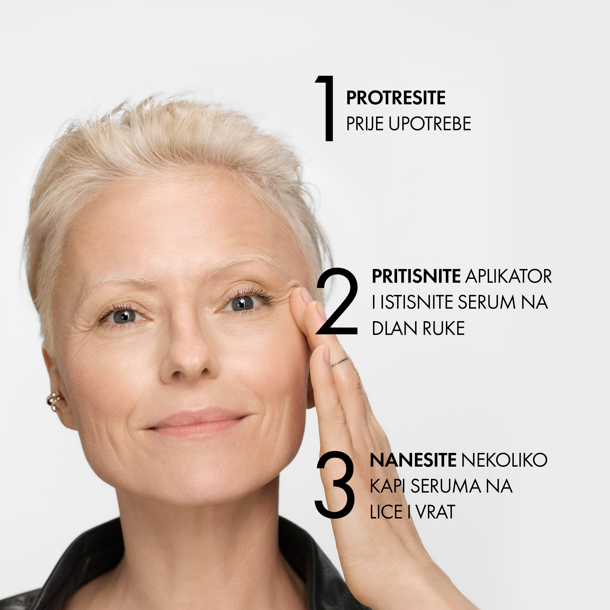 Prije upotrebe dobro protresite. Nanesite dva puta dnevno prije kreme. Izbjegavajte kontakt s očima i usnama.