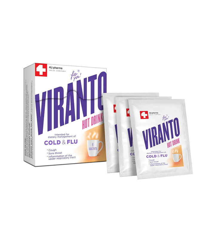 Viranto HOT drink for you! je prašak za pripremu napitka prijatnog ukusa limuna i osvežavajućeg mentola. Namijenjen je za primjenu kod simptoma prehlade i gripe, a preporučuje se i kod upale grla, kašlja i respiratornih tegoba, kao i kod oslabljenog imuniteta. Sadrži sastojke biljnog porijekla, vitamine i minerale: ekstrakt korijena pelargonijuma, ekstrakt ploda zove, acerole i šipurka, ekstrakt kore bijele vrbe, cink, bakar i vitamin D. Takođe, sadrži i prirodan vitamin C iz plodova acerole i šipurka. Namijenjen je starijima od 18 godina.