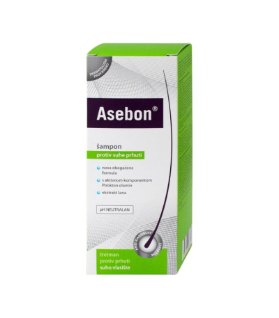 Asebon šampon protiv suhe peruti namijenjen je za uklanjanje peruti na suhom vlasištu. Sadrži ekstrakt lana, koji hidratizira te njeguje vlasište. Asebon šampon protiv suhe peruti sa snažnom kombinacijom aktivnih tvari i vitaminskim kompleksom hrani kosu, djeluje umirujuće te učinkovito uklanja peruti. Uz to aktivni sastojci značajno smanjuju mogućnost pucanja vrhova te garantiraju zdravu i kosu i vlasište. Šampon je pH neutralan te ugodnog i blagog mirisa.