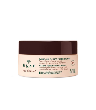 Nuxe Rêve de Miel® topivi uljni balzam za tijelo s medom i dragocjenim prirodnim uljima idealan je za suhu do vrlo suhu kožu. Smanjuje iritacije te intenzivno obnavlja i hrani kožu te ju obavija slatkim mirisom meda, mimoze i bagrema. Prilikom nanošenja pretvara se u ulje, bez masnog i ljepljivog osjećaja na koži. Koži je vraćena udobnost i olakšanje, bez svrbeži i iritacija. Sadrži 93 % sastojaka prirodnog podrijetla.