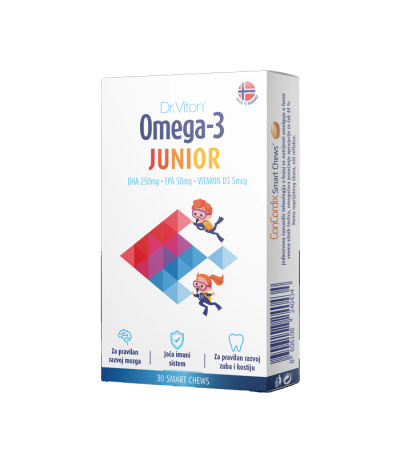 20,75KMDr. Viton Omega – 3 junior, 30 tableta za žvakanje namijenjene djeci koja imaju više od 3 godine. Upotrebom samo jedne tablete za žvakanje, unosi se preporučena dnevna doza omega – 3 masnih kiselina i vitamina D3.