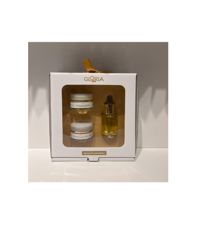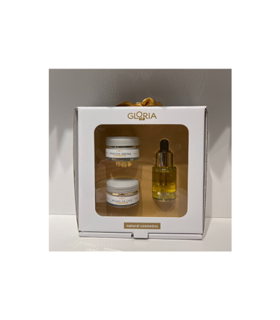 čišćenje lica (30 ml), zlatni serum (1 ml) i balzam za usne (2,5 g).